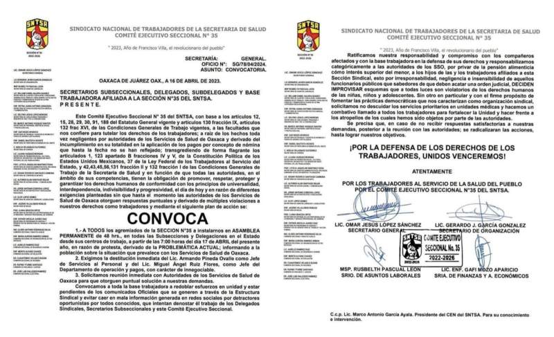 Ante esta situación, y en espera de una inmediata respuesta, así como la reunión con los representantes de los Servicios de Salud de Oaxaca, acordaron irse a asamblea permanente por 48 horas.