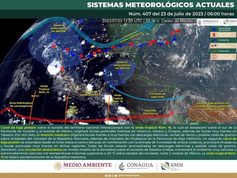 Oaxaca de Juárez, Oax. 23 de julio de 2023.- La Coordinación Estatal de Protección Civil y Gestión de Riesgos (CEPCyGR) informa sobre la actividad que generará la onda tropical número 16, la cual ingresará al territorio oaxaqueño la tarde de este domingo.