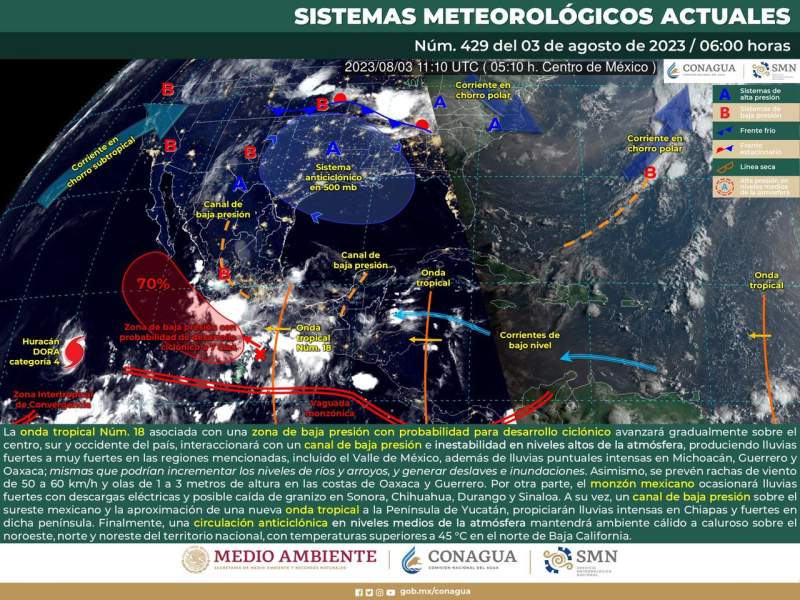 Oaxaca de Juárez, Oax. 3 de agosto del 2023.- La Coordinación Estatal de Protección Civil y Gestión de Riesgos (CEPCyGR) informa sobre la actividad de la onda tropical número 18, la cual dejará lluvias fuertes, actividad eléctrica y rachas de viento en el estado acoplándose con un canal de baja presión en el centro del país, lo anterior debido al pronóstico del tiempo emitido por la Comisión Nacional del Agua (Conagua).