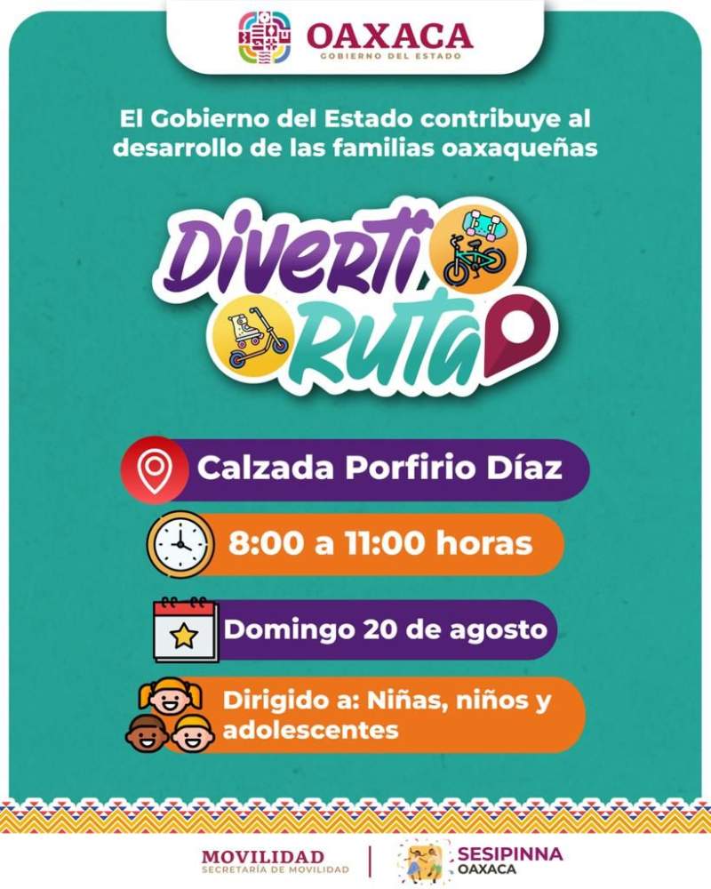 Oaxaca de Juárez, Oax. 16 de agosto de 2023. Este domingo 20 de agosto niñas, niños, adolescentes y público en general podrán disfrutar de más de 40 actividades lúdicas, recreativas y deportivas que forman parte de la DivertiRuta, una iniciativa del Gobierno de Oaxaca que busca la apropiación de los espacios públicos para la diversión y sana convivencia.