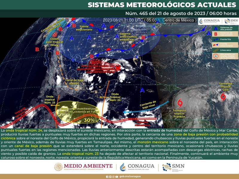 Oaxaca de Juárez, Oax. 21 de agosto de 2023.- La Coordinación Estatal de Protección Civil y Gestión de Riesgos (CEPCyGR) informa el pronóstico del tiempo emitido por la Comisión Nacional del agua (Conagua), para el cual se prevé que la entrada de humedad del pacífico ocasionará lluvias aisladas con tormentas dispersas por la tarde, algunas áreas de tormentas estarán asociadas con actividad eléctrica y rachas de viento con mayor intensidad en zonas montañosas.