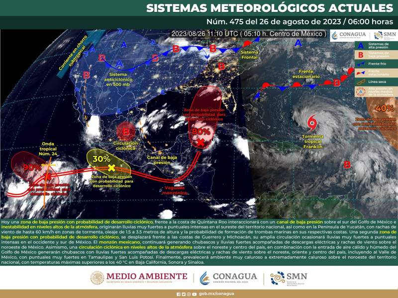 Oaxaca de Juárez, Oax. 26 de agosto de 2023.- La Coordinación Estatal de Protección Civil y Gestión de Riesgos (CEPCyGR) informa el pronóstico del tiempo emitido por la Comisión Nacional del Agua (Conagua), en el que se prevén lluvias, tormentas, actividad eléctrica y rachas de viento en diferentes puntos del estado, esto debido a un canal de baja presión al interior del país.