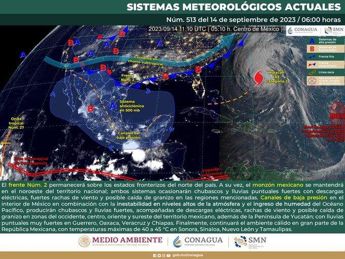 Oaxaca de Juárez, Oax. 14 de septiembre de 2023.- Para la tarde de este jueves se prevén lluvias ligeras y tormentas aisladas en la tarde-noche con mayor énfasis en zonas montañosas, esto debido a un canal de baja presión al interior y sureste del país.