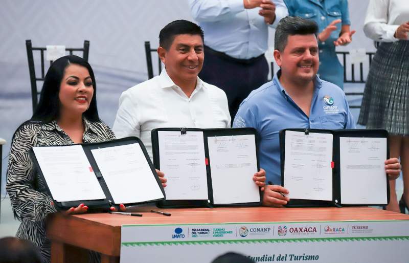 En el marco del Día Mundial del Turismo 2023, que en este año tiene como lema Pequeñas Semillas, inversiones verdes, el Mandatario Estatal encabezó este encuentro en el que el director regional de la Conanp Pável Palacios Chávez y la secretaria de Turismo del Estado (Sectur Oaxaca) Saymi Pineda Velasco signaron el documento.
