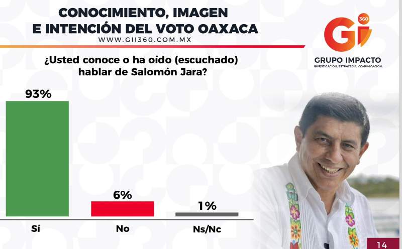 Un segundo cuestionamiento a las y los consultados fue ¿Usted conoce o ha oído (escuchado) hablar de Salomón Jara?, teniendo como respuesta que un 93 por ciento de los consultados lo conoce, un 6% no y un 1% dijo no saber o no conocerlo.