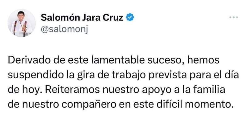 “Derivado de este lamentable suceso, hemos suspendido la gira de trabajo prevista para el día de hoy. Reiteramos nuestro apoyo a la familia de nuestro compañero en este difícil momento”, escribió.