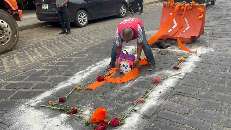 Con flores de cempasúchil y adornos alusivos al Día de Muertos simulando una tumba, fue adornado un socavón que se formó desde hace algunos días sobre la calle Armenta y López, en el centro de la ciudad de Oaxaca.