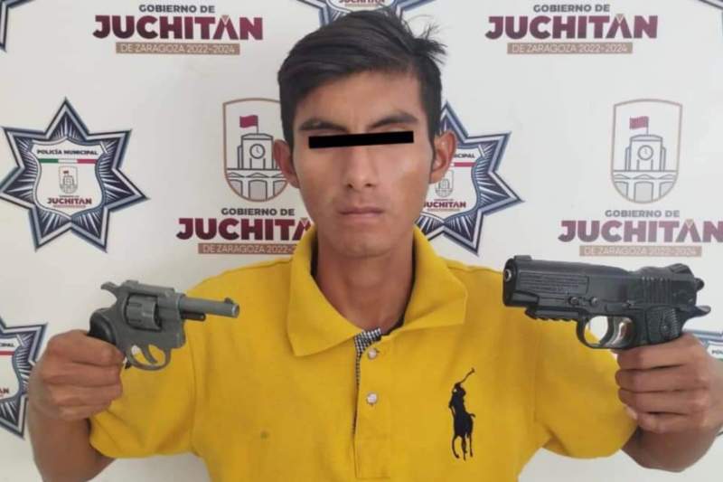 Elementos de la Policía Municipal de JUCHITÁN lograron la detención de un sujeto, mismo quien traía entre sus pertenencias, dos replicas armas de fuego, además de una bolsa de nylon con polvo blanco con características propias de la cocaína.