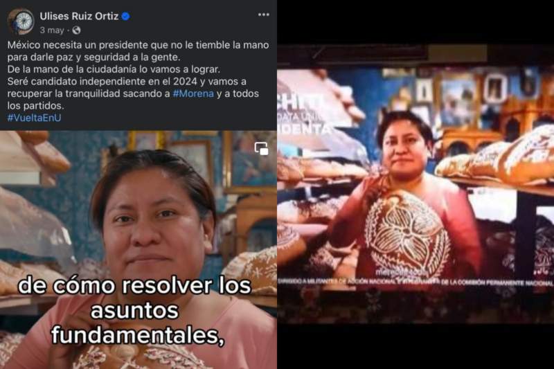 La imagen utilizada por ambos personajes, muestra a la periodista Carina García con un pan de muerto tradicional de Mitla, Oaxaca en sus manos.