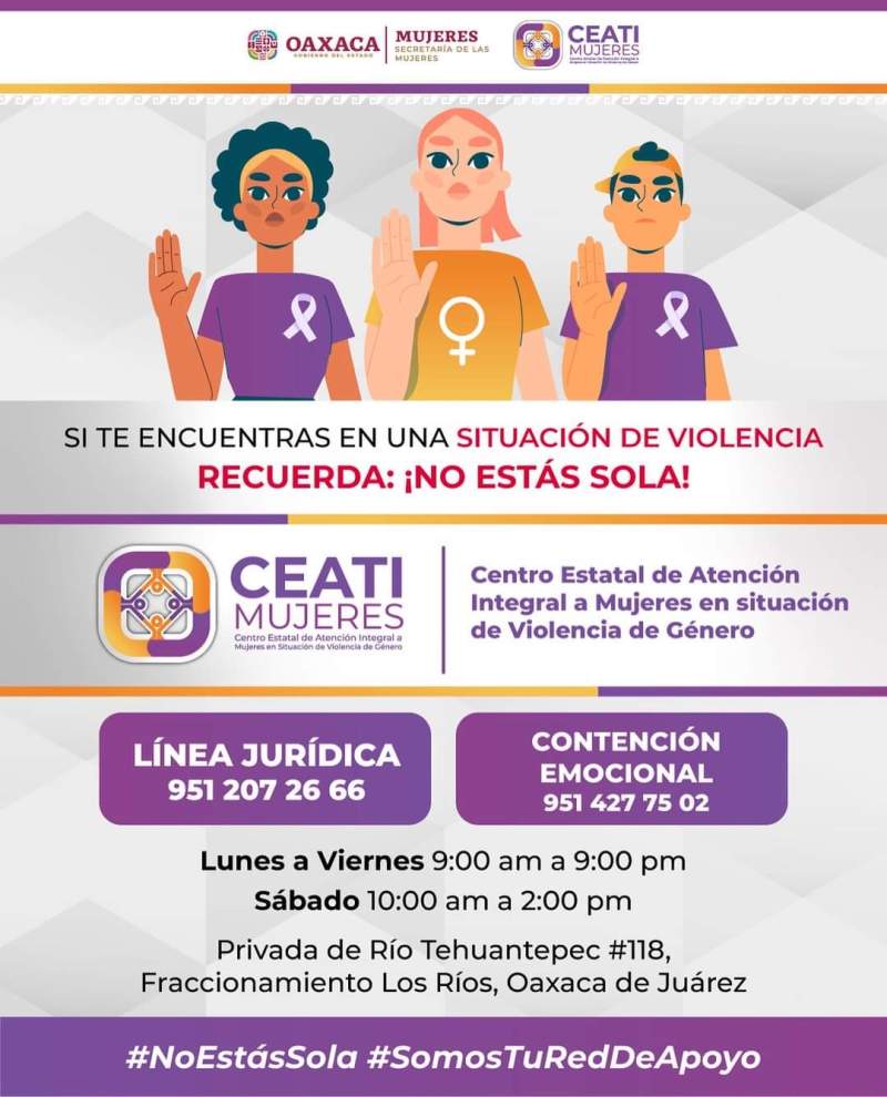 La SM ofrece estos servicios en su Centro Estatal de Atención Integral a Mujeres en Situación de Violencia de Género (Ceati), donde se brinda atención jurídica en el teléfono 951 207 26 66, en materia de contención emocional en el 951 427 75 02, así como acompañamiento psicológico en tanatología de manera presencial y vía telefónica y servicio de ludoteca especializada.