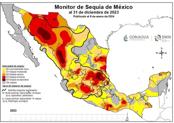 El Gobierno federal resaltó que la sequía severa se caracteriza por ocasionar “probables pérdidas en cultivos o pastos, alto riesgo de incendios (y) es común la escasez de agua”, por lo que se deben imponer restricciones en el uso del agua.
