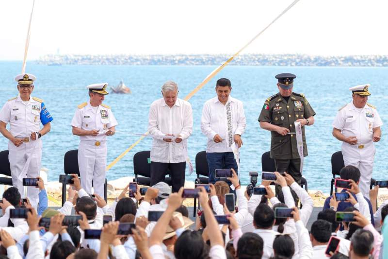 Salina Cruz, Oax. 26 de febrero de 2024.- La ruta comercial marítima entre los océanos Pacífico y Atlántico es hoy una realidad con la inauguración del Rompeolas Oeste en el Puerto de Salina Cruz, un proyecto estratégico que forma parte logística del Corredor Interoceánico del Istmo de Tehuantepec (CIIT), así lo destacó el Presidente Andrés Manuel López Obrador en este día histórico para Oaxaca.
