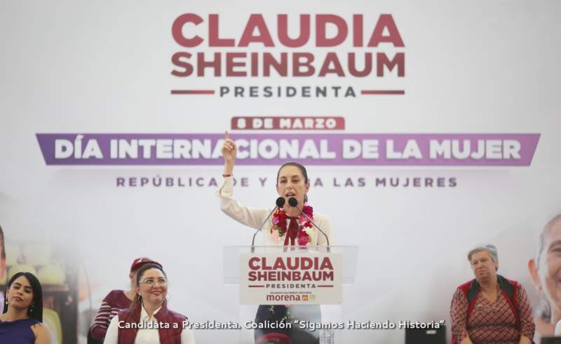 Por la mañana, al celebrar el Día Internacional de la Mujer en Tultitlán, Sheinbaum señaló que después de 200 años de la República por primera vez en la historia del país va a haber una mujer en la Presidencia y una que «es humanista y transformadora».