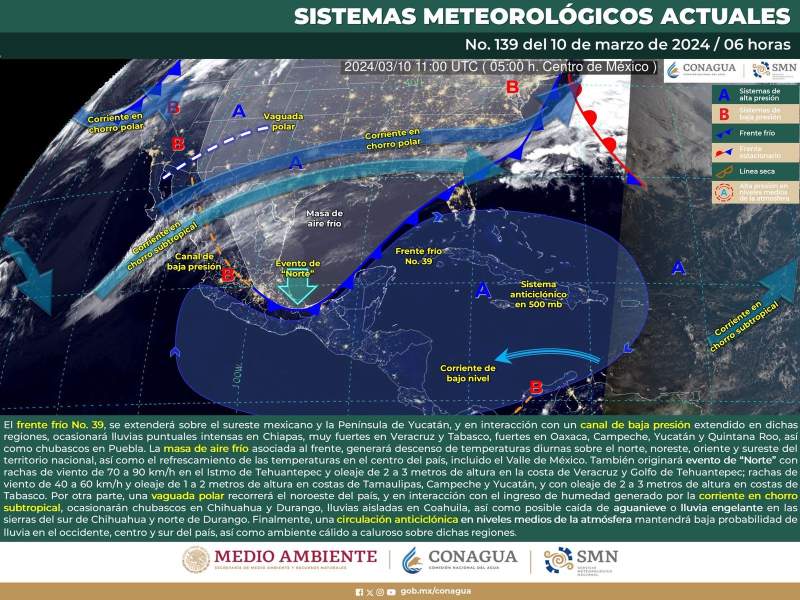 Oaxaca de Juárez, Oax. 10 de marzo de 2024.- La Coordinación Estatal de Protección Civil y Gestión de Riesgos (CEPCyGR) informa que el frente frío número 39 se extenderá sobre el sureste de México y Península de Yucatán, ocasionando así algunas lluvias con chubascos aislados y asociados con ligeros refrescamientos durante la tarde en la Cuenca del Papaloapan, Sierra de Juárez y Sierra Sur.