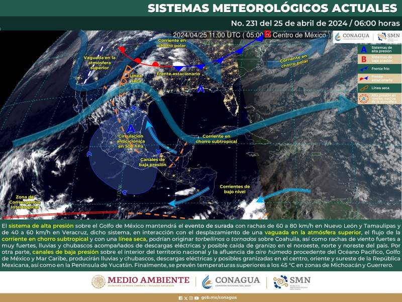 Lo anterior, de acuerdo con la Comisión Nacional del Agua (Conagua) que señala que los canales de baja presión en el interior de la República Mexicana en combinación con una ligera entrada de humedad en el Océano Pacífico y Golfo de México, ocasionarán lluvias con chubascos aislados en zonas montañosas de la entidad.