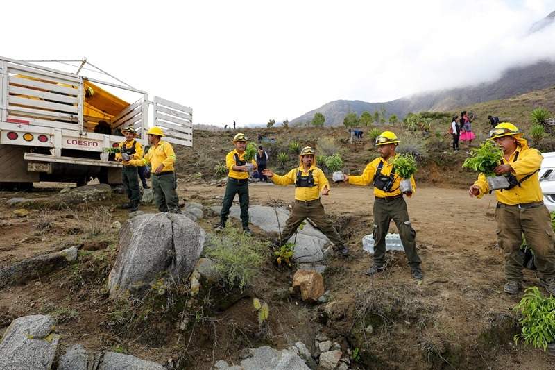 Las acciones en las que participan más de 500 personas son coordinadas por la Comisión Estatal Forestal (Coesfo) y consisten en la plantación de 10 mil ejemplares donados a través de los viveros de Reforesta Oaxaca de esta dependencia, entre los que destacan las especies Pipe, Pinus Oaxacana, Maguey silvestre y plantas nativas como Guaje.