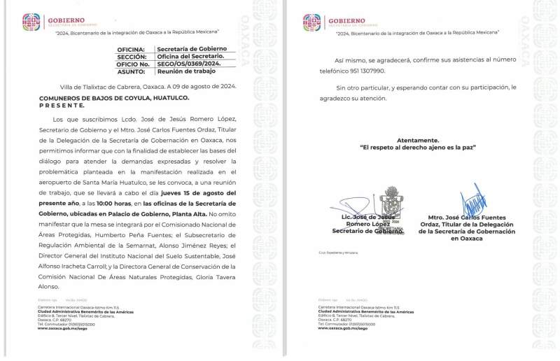 La Secretaría de Gobierno (Sego) reitera el respeto a la libre manifestación de las personas pobladoras de Bajos de Coyula, Huatulco, quienes este viernes mantienen un bloqueo en inmediaciones del Aeropuerto de Huatulco; sin embargo, exhorta a habitantes de ambas comunidades a evitar afectaciones a terceros, ello pese a los reiterados llamados al diálogo.