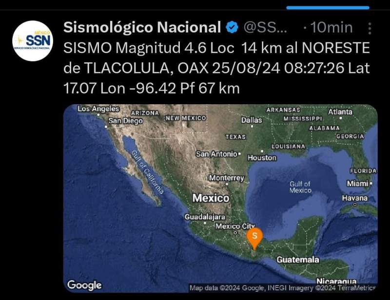 La Coordinación Estatal de Protección Civil y Gestión de Riesgos (CEPCyGR) informa que a las 8:27 horas de este día domingo 25 de agosto, se detectó un sismo de magnitud 4.6 localizado a 14 kilómetros al noreste de Tlacolula de Matamoros, Oaxaca.