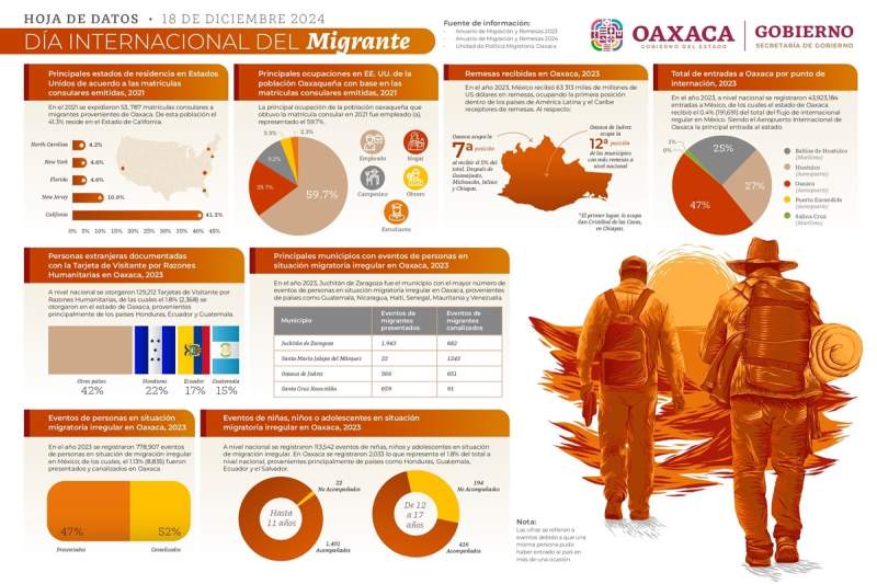 De acuerdo con la Sego y de datos obtenidos del Anuario de Migración y Remesas 2023, en ese mismo año, México recibió 63 mil 313 millones de dólares, siendo la primera posición dentro de los países de América Latina y el Caribe receptores de remesas. Conforme a este documento, en 2023 se registraron 778 mil 907 eventos de personas en situación de migración irregular en México; de las cuales, el 1.13 por ciento (8,835) fueron presentadas y canalizadas en Oaxaca.