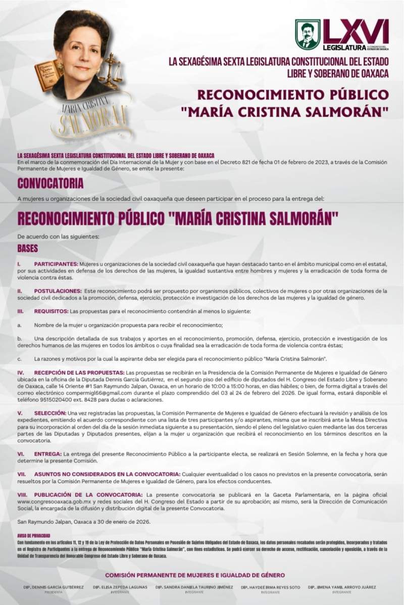 San Raymundo Jalpan, Oax., 07 de febrero de 2026.- La LXVI Legislatura del Congreso de Oaxaca emitió la convocatoria para participar en el proceso para la entrega del Reconocimiento Público “María Cristina Salmorán” 2026, en el marco de la conmemoración del Día Internacional de la Mujer.